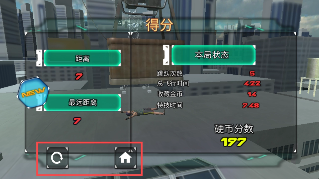 4、游戏结束后,若想查看【得分】界面的详细数据,可点击左下角按钮重新开启游戏,或者点击右下角按钮返回主界面。