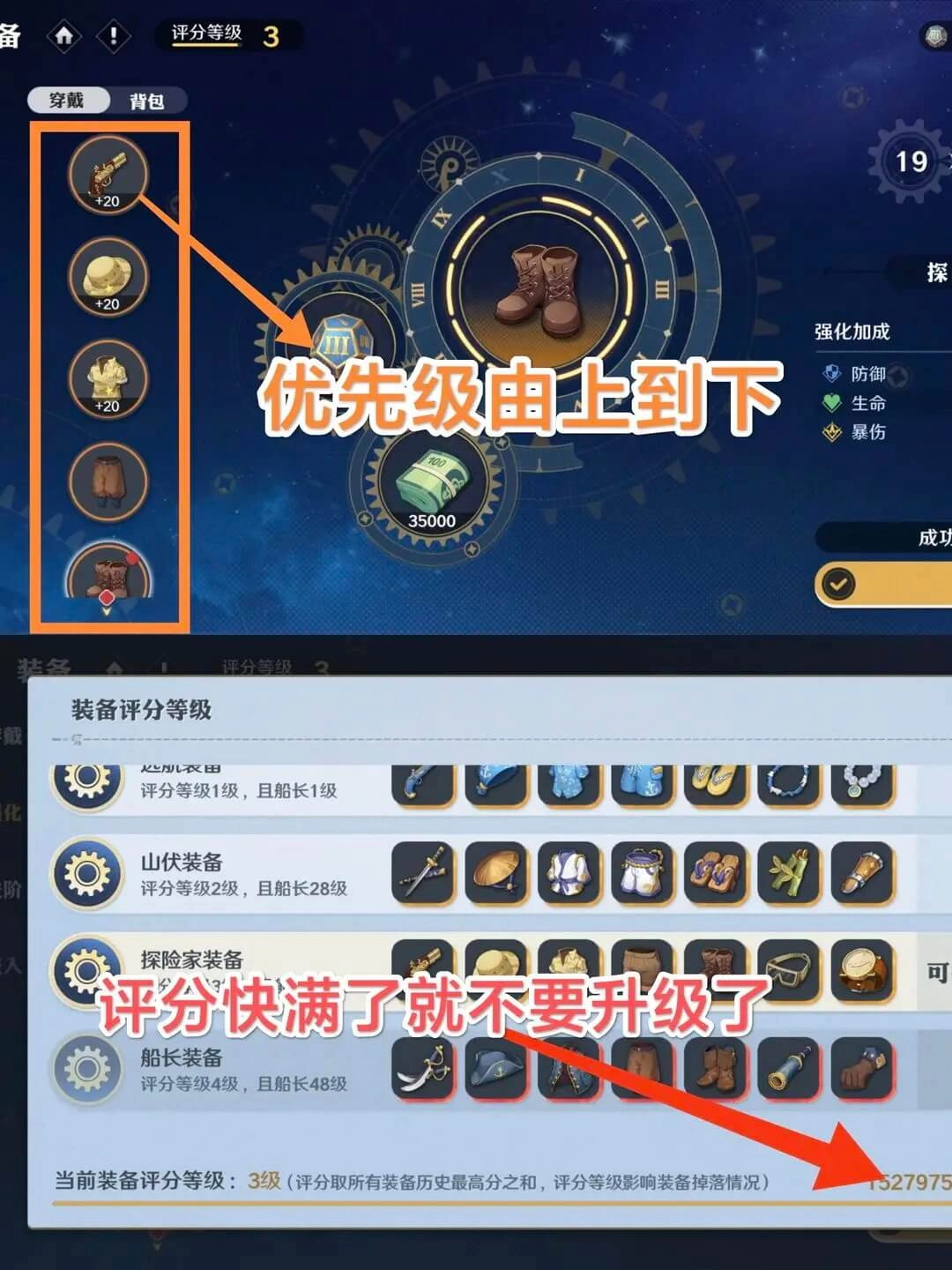 需要留意的是,关于装备评价,实际上只要将你所拥有的最高级装备穿戴在身上,就能提升相应分数。分数提升后,便有机会掉落更高级别的装备。要是你当前身上穿着的已然是你现阶段所能穿戴的最高等级装备,那就对装备进行升级。装备升级的优先级顺序是从上至下,武器的优先级最高,其次是帽子,接着是衣服,依此类推。倘若你目前身上装备等级为3级,然而装备评级已达到4级或者即将达到4级,这种情况下就无需再进行升级了。
