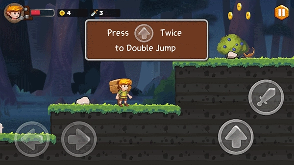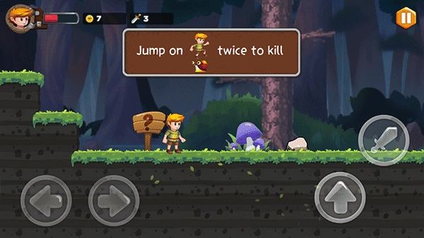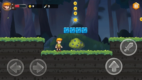 游戏采用经典的操控方式,左下角区域用于控制角色方向,右下角区域则承担跳跃和收集金币的功能。当玩家获得武器后,还能进一步使用攻击技能。
