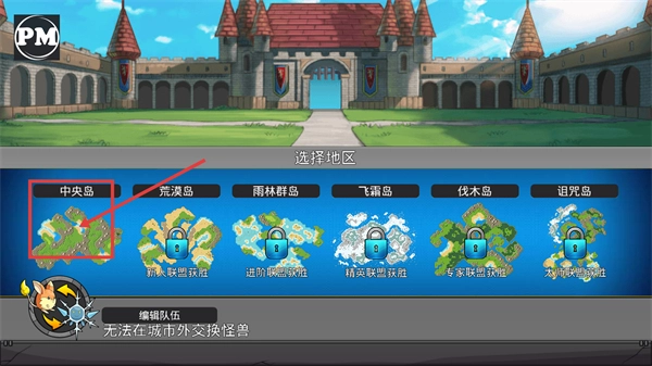 选择地区时建议优先从【中央岛】开启探索之旅,荒漠岛、雨林群岛等其他岛屿则需要分别满足新人、进阶等联盟获胜条件方可解锁。