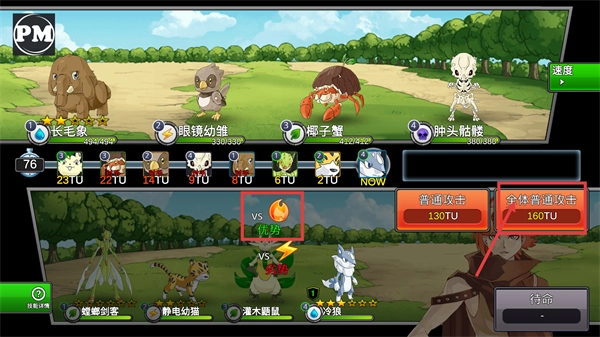 战斗时遇到【长毛象】【眼镜幼雏】这类怪兽,要留意属性克制情况,比如【VS-优势】,并合理选用【全体普通攻击-160TU】这类技能进行输出。