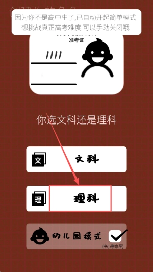 选择科目:在模式选择界面点击“文科”或“理科”选项,系统会依据你的身份信息自动匹配对应难度,确认点击后就能正式开启考试挑战环节。