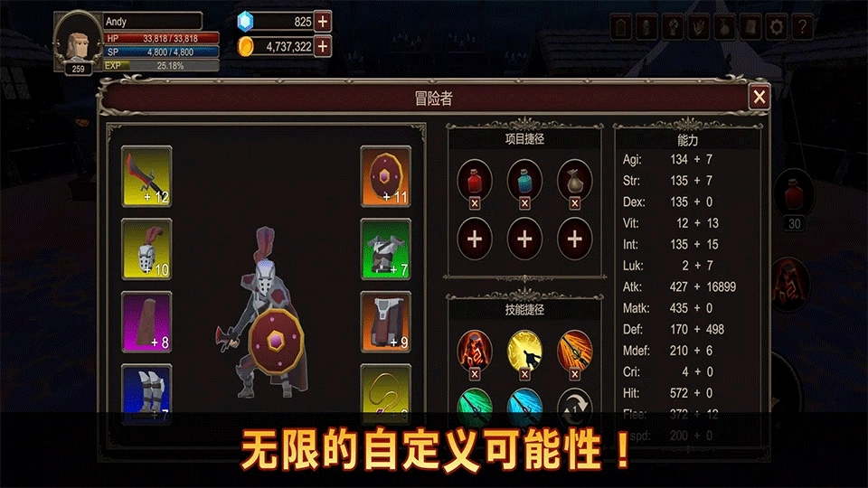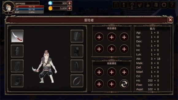点击右上角头盔图案按钮,则可以查看装备和能力值。
