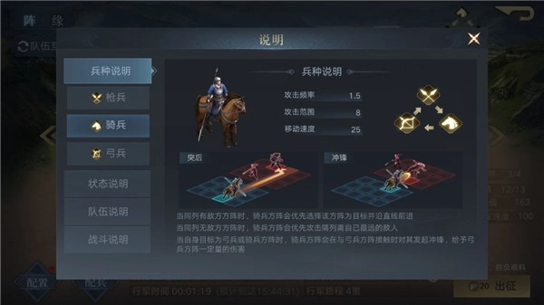 各位主公在布阵界面就能看到兵种之间的克制关系:骑兵专门克制弓兵,既能直接切入敌方后排,也可以攻击邻排位置最远的敌军;枪兵则是骑兵的克星,最适合用来和对面的骑兵对位,要是对位没有敌军,就会自动寻找最近的敌方部队;弓兵能够克制枪兵,属于后排输出单位,需要重点注意保护。