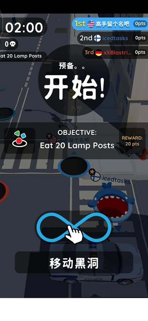 黑洞大作战和以往贪吃蛇这类游戏相似,玩家各自操控自己的黑洞去吞食物品。每一局都设有时间限制,时间显示在屏幕左上角。