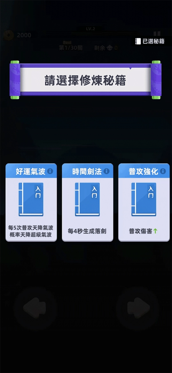 击败后的敌人会掉落钻石,收集后能提升等级,每升一级就能获得一次选择秘籍的机会