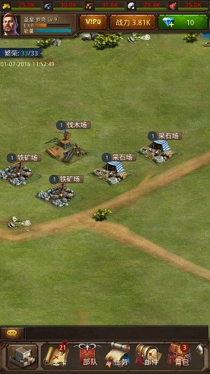 若出现产量不平衡的情况,可以通过采集矿点来进行调节。另外需要提醒大家的是,铁、木、石这三类资源的产地总数最多为35块,每提升2级城镇中心等级,就会增加1块资源产地,直到城镇中心等级达到62级时,资源产地数量的上限就会封顶。