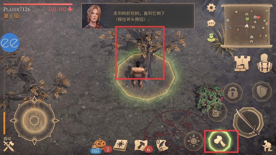 走到树的跟前,按住斧头对应的按钮进行砍树操作,一直砍到树倒下,这样就能完成砍树的任务了。