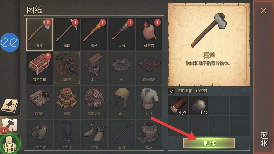 在图纸界面选中【石斧】,点击【制作】按钮,即可得到砍树用的工具。