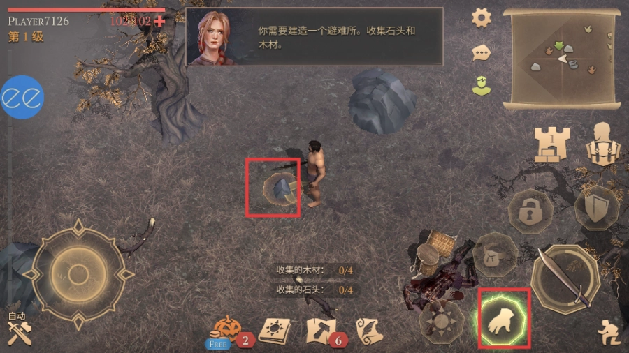 收集石头和木材,用于建造避难所,推进游戏任务。