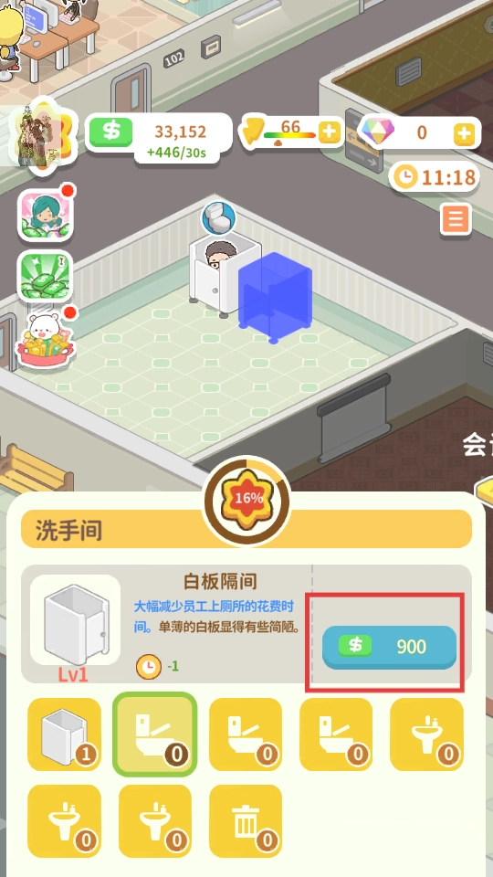 投入【900】用于洗手间白板隔间的升级改造,以此缩短员工如厕耗时,并优化办公环境。