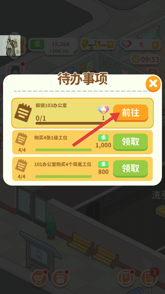 处理待办事项,点击【前往】解锁103办公室,推进公司建设。