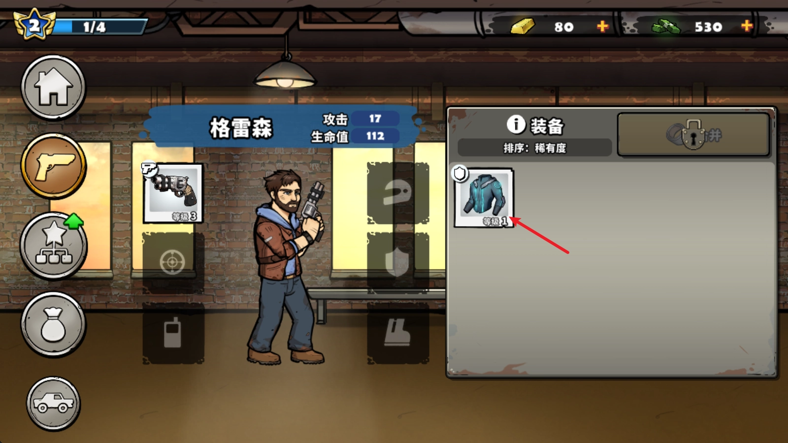 我们需要先通过场景1的第10个房间,装备功能才会开启,之后再点击左侧的第二个按钮。