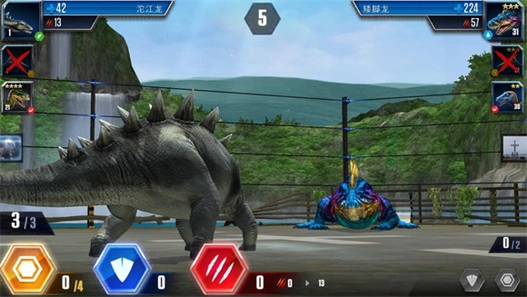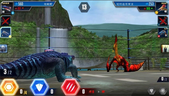 开局,先等一下,对面的恐龙会用两次攻击解决掉你的第一只龙,这时候对方恐龙手里已经没牌了。接着让第二只主力龙上场,根据对方的血量来决定攻击几次,剩下的操作都选等待就好。