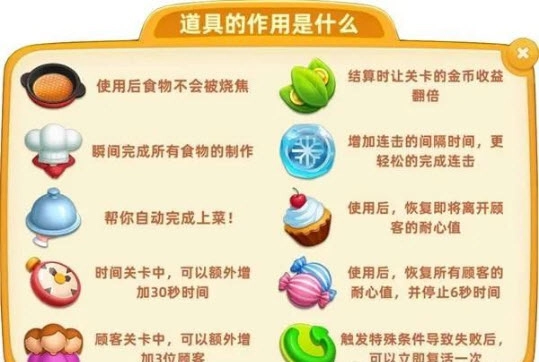 游戏里准备了多样的道具,它们会是你烹饪旅程中的可靠帮手。像有的道具能提升食物制作的效率,让你在较短时间内处理更多订单;还有些道具可以提高顾客的耐心值,使他们乐意等待更久。恰当运用这些道具,不仅能助你从容应对各类难题,还能让你在烹饪之路上愈发得心应手。