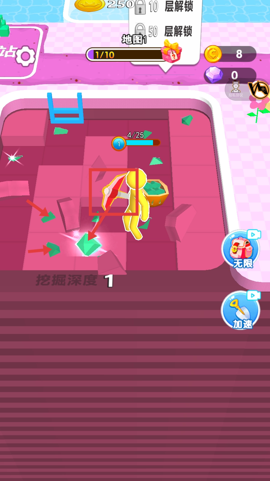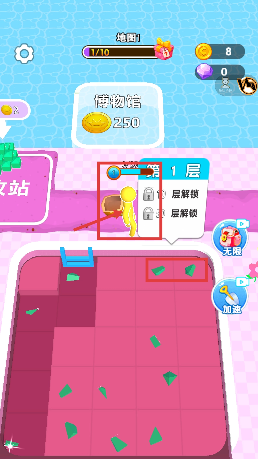 在【地图1-第1层】场景中,你需要操控黄色小人借助工具开采绿色矿石,以此来积累资源;同时可以查看【博物馆-250】对应的金币目标,借此熟悉挖矿的基本操作。