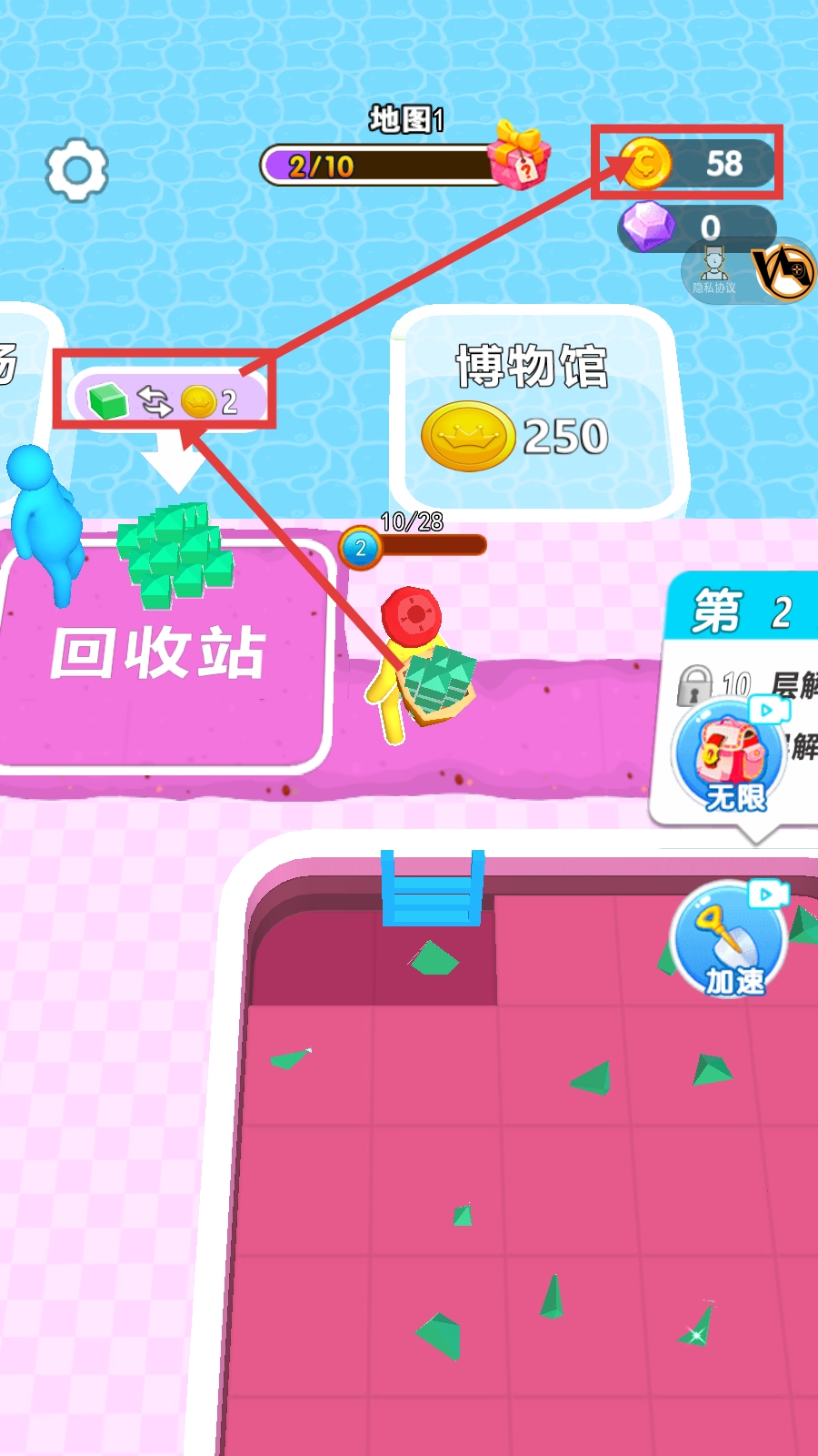 把矿石运到【回收站】去换取金币,像【绿色方块能兑换2个金币】这样,把金币攒到【58】的数量,以此来增加资源储备。