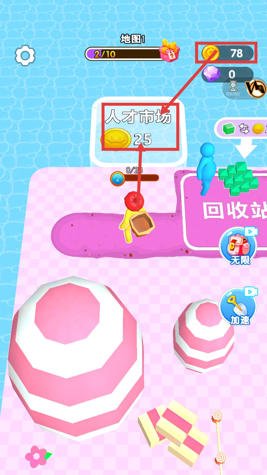 前往【人才市场】,消耗【25】金币解锁对应功能,将金币积攒到【78】后,即可推动游戏进程,解锁全新区域。
