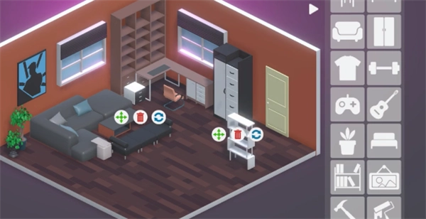 在房间布置界面中,蓝灰色的立方体房间左侧设有发光的窗户,右侧的物品选择栏里整齐排列着沙发、衣柜等各类家具图标,用户可从中挑选心仪的家具进行布置。