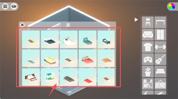 在床具挑选界面中,顶部的灰色区域清晰标注着“床”的字样,中间由红色边框勾勒出的区域里陈列着16张风格各异的床品图片,只需点击选中心仪的床型,即可实时查看其搭配效果。
