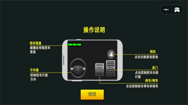 在游戏驾驶闯关中,驾驶车辆需遵循以下规则: - 损坏程度:校车发生碰撞时会受损; - 相机:点击可切换游戏视角; - 方向盘:用于控制校车的行驶方向; - 油门:点击后校车将向前行驶; - 刹车/倒车:点击可实现校车停车或倒车操作。