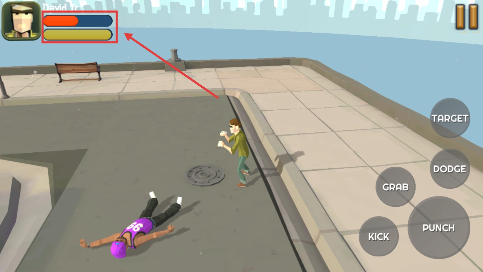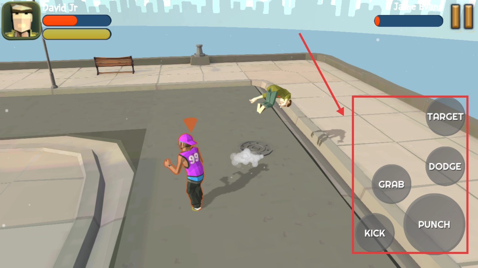 2、战斗过程中,点击右侧的【PUNCH】、【KICK】即可对敌人发起攻击,此外还能进行抓取对手、闪避等操作,灵活应对战斗局势吧。