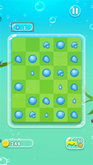 游戏界面上方显示着水滴的剩余数量,玩家必须在这些水滴消耗殆尽之前,把当前关卡里所有的水滴都击碎。
