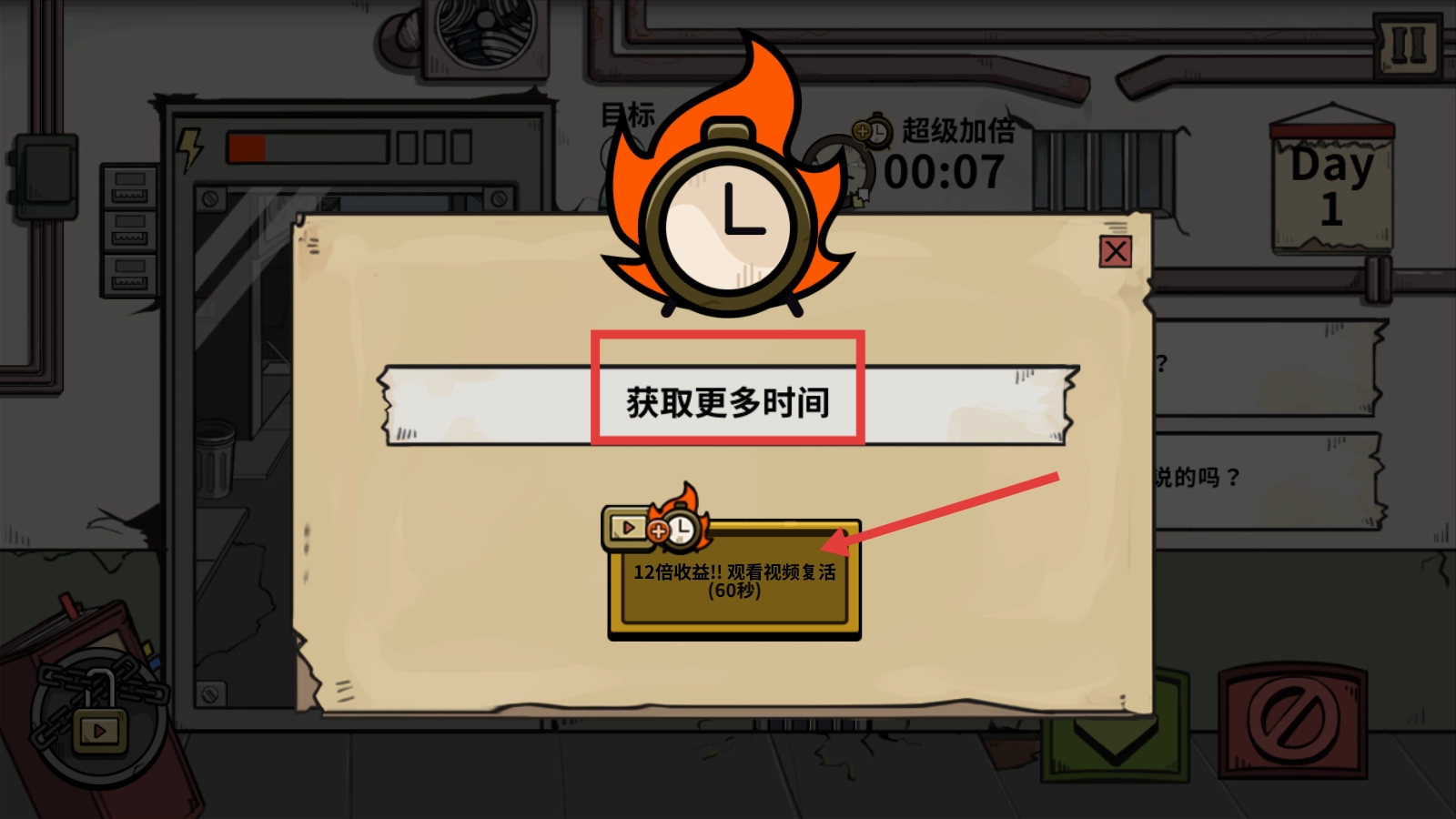 当时间用完,弹出【是否想要继续游戏?】的提示时,你可以选择免费复活或者通过观看视频复活来继续进行游戏。