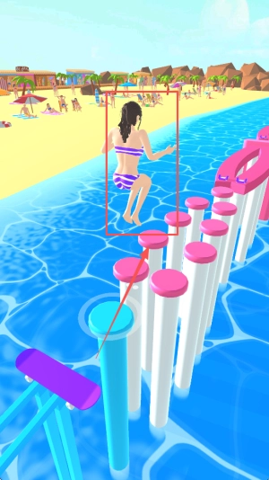 玩法为跳跃闯关:操控角色持续跳跃以防掉入水中,根据赛道的变化来调整姿势,每通过一段赛道都会充满成就感,适合用于休闲解压的场景。