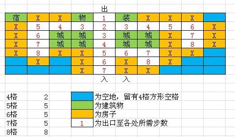 这张图能保证从出口或建筑物到任意位置的房屋都不超过8步距离。宿屋是一定要建造的,不然NPC倒下后,其他NPC不会过来帮忙救治,只会在原地等体力恢复后就马上回家或者离开村子。要是宿屋在能到达的范围内,救助倒下NPC的人就会背着他到宿屋休息。