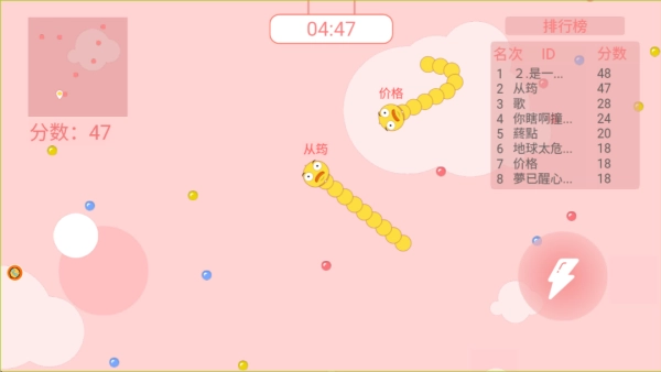 踏入竞技场后,玩家得留意顶部的倒计时与右边的排名,持续积累更高分数,通过淘汰其他贪吃蛇来赢得最终的胜利!