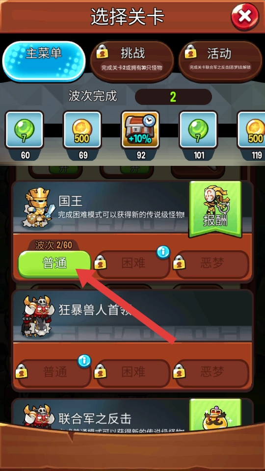 在关卡选择界面,点击【普通】难度的按钮,即可进入相应关卡并开始游戏。