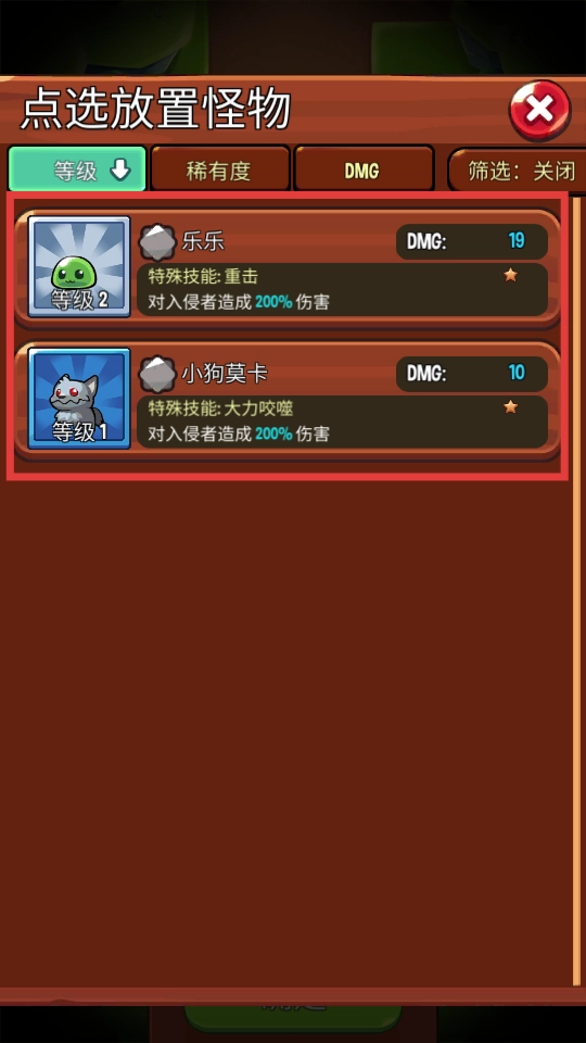 在怪物选择界面,挑选合适的怪物(比如等级2的乐乐、等级1的小狗莫卡这类),可以依据它们的技能特点和伤害属性来做选择。