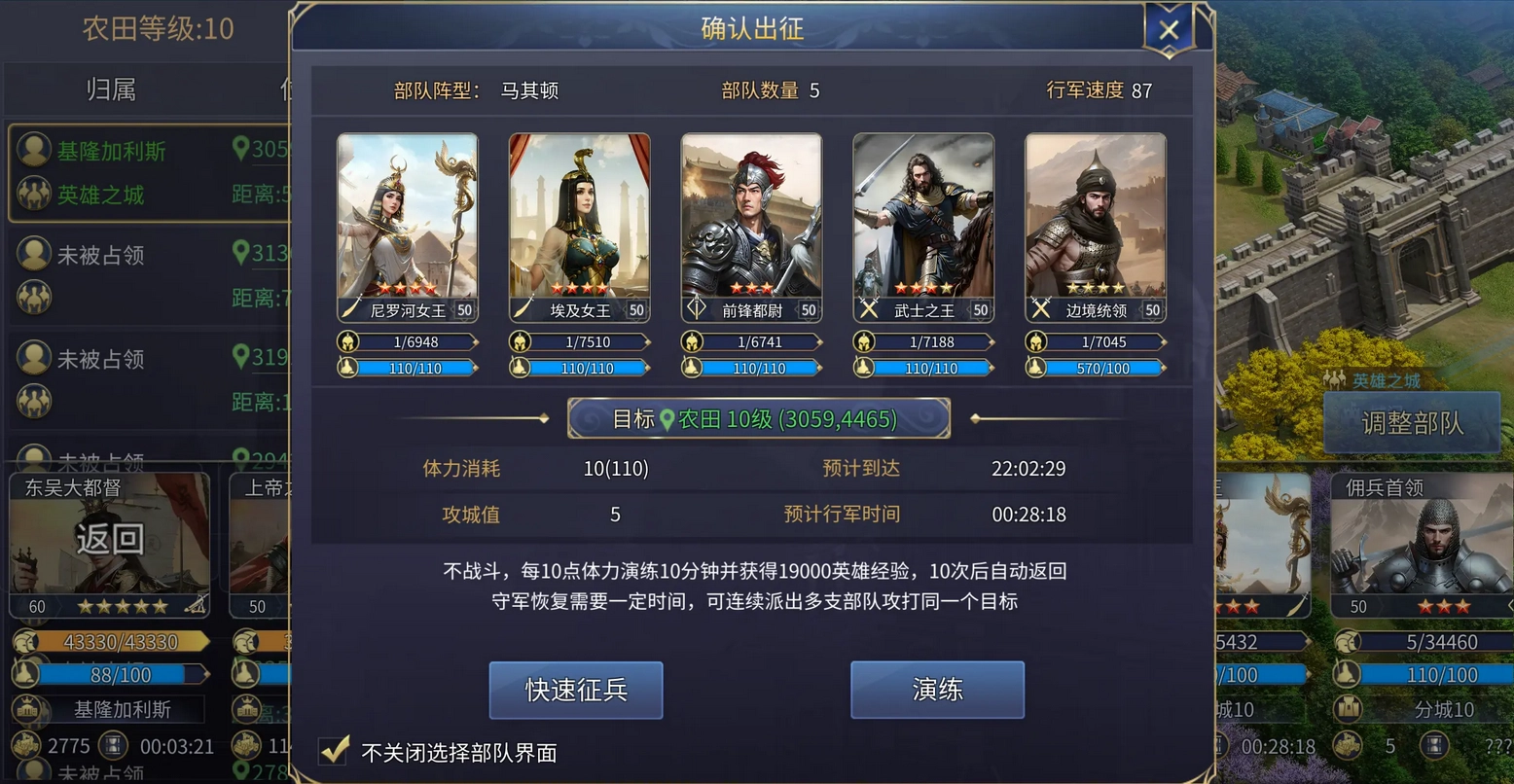 演练对象以10级农田为例,每次演练可获取17.1万经验。尽管经验数值不算高,但该方式无战损且操作简便。对于时间紧张的玩家而言,若每晚和早起各进行一次演练,一周下来足以提升三四级。当然,若急于升级,也可通过给角色喝水补体的方式增加演练次数,一天内大约能完成五到六次演练,累计经验接近一百万,这一收益也相当可观。