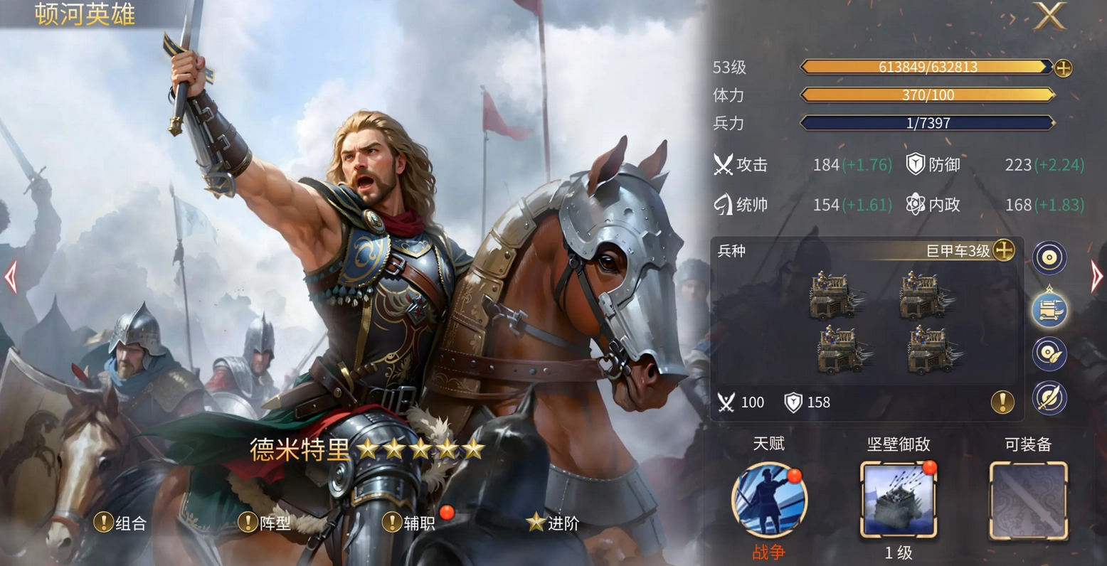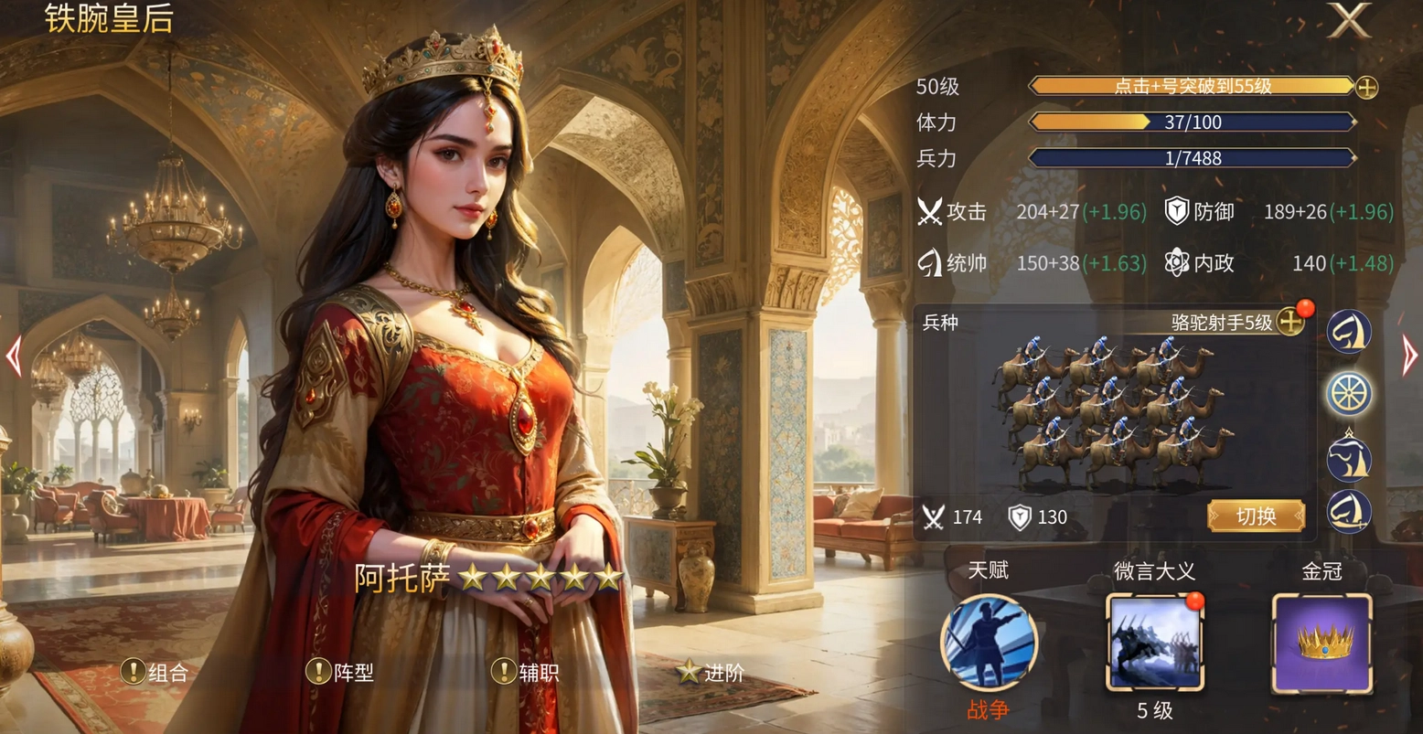 我们先看看英雄图鉴里每个骑兵将领对应的兵种。不难发现,很多英雄都配有双轮战车兵种,而需要骆驼射手的英雄少之又少。这样问题就很清楚了——我们升级皇后的骆驼兵种,就能把适用范围更大的战车兵种卡留存下来,慢慢积攒。