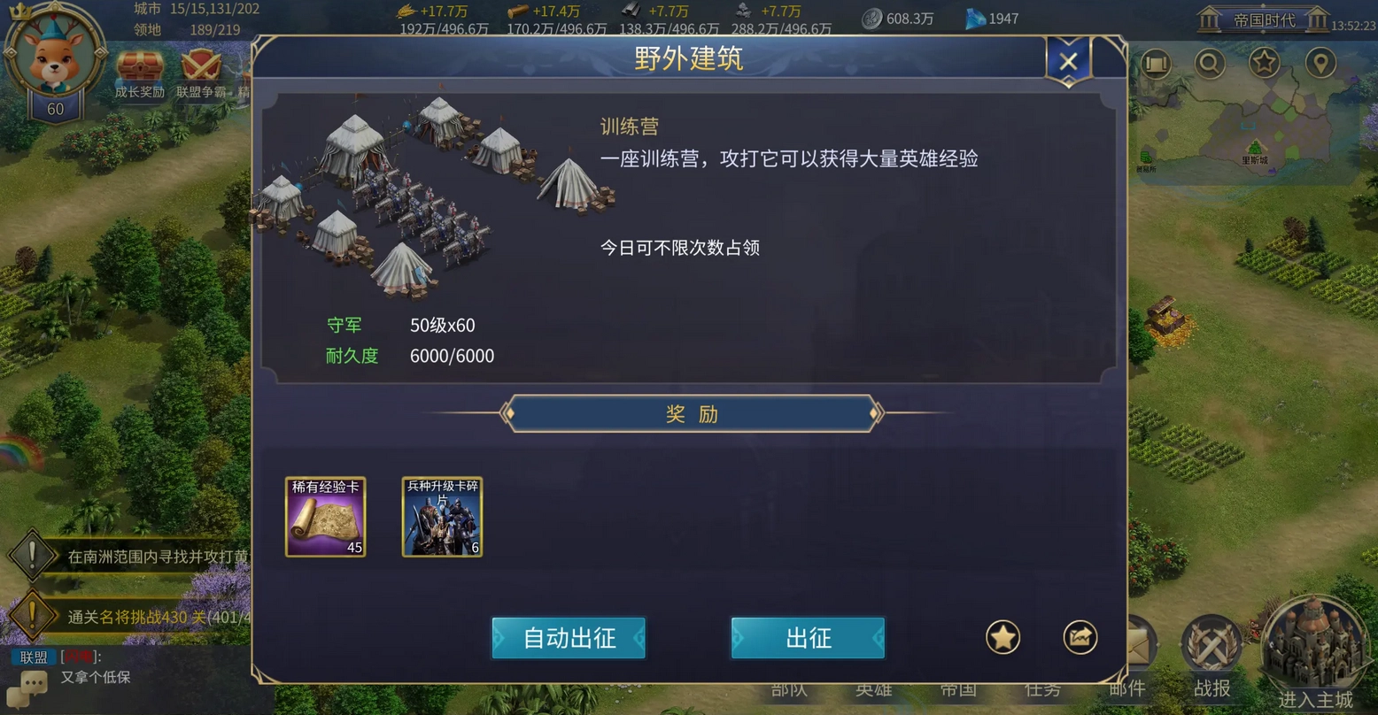 关于周末刷训练营练级,还有两点需要留意:一是若你有辅助且队伍强度颇高,记得关闭自动出征,毕竟训练营守军每30分钟刷新一次,得给守军留出刷新时间(守军发丝凌乱,望着步步逼近的周瑜,娇容失色道:“官人,就让奴家喘口气歇歇吧”);二是要是等不及30分钟的刷新间隔,可寻一处两座训练营距离较近的位置,将主城安置在它们中间,刷完一座的守军就去刷另一座,让前者有时间恢复(这便是“一龙戏二凤”之法);或者把主城设在一座训练营旁,再在有兵的分城附近找另一座训练营,主城这边的守军刷完后,就去分城重组队伍,接着刷分城那边的训练营。
