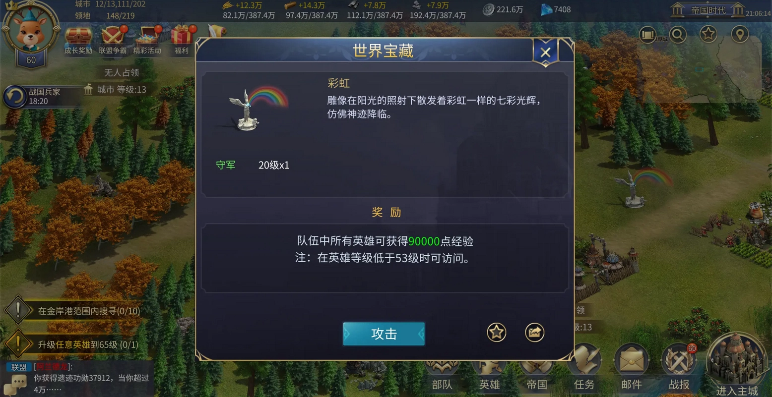 当然,和在秘境里轻松刷彩虹比起来,在新大陆刷彩虹确实要辛苦些——彩虹之间的间隔距离更远。而且进入文明一阶段后,新大陆彩虹的等级上限是53级,比秘境要低(不过在文明一之前,两者的等级上限是一样的)。不过新大陆刷彩虹也有它的好处:没有时间限制。要是你的部队需要大量经验(比如从1级开始升级),或者有多支部队等着升级,秘境半小时的时长不够刷的话,去新大陆就是个挺不错的选择。另外,悄悄分享个小技巧:彩虹的刷新位置是固定的,你可以在新大陆找几个周围全是彩虹的好地方,升级时来回飞着把这些彩虹刷完,等地图刷新资源的时候,新的彩虹又会在原来的位置重新出现,这样就能重复利用这些点位啦。
