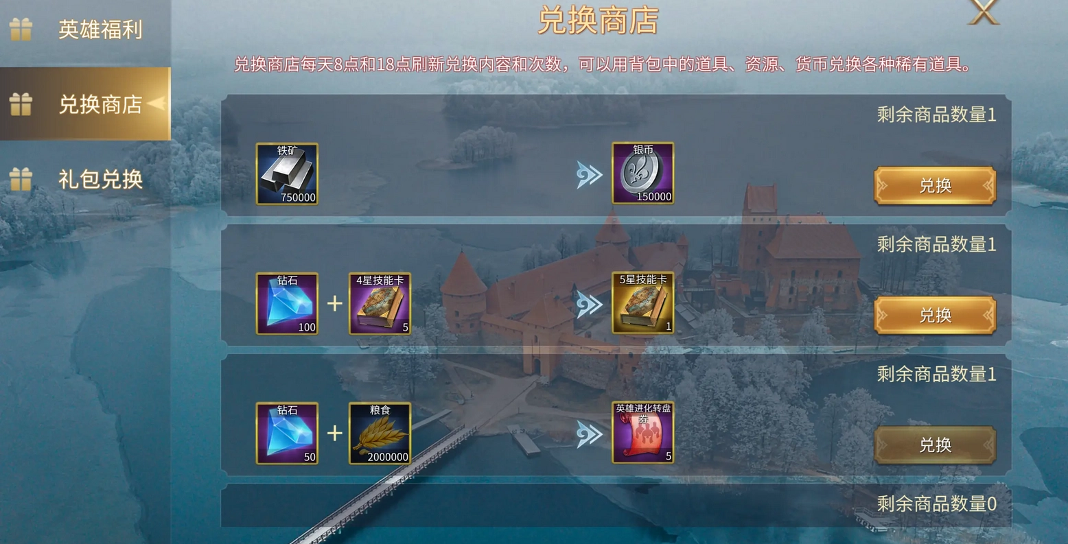 如图所示,100钻石加上若干次要资源就能兑换一张五星技能卡。兑换商店每日刷新两次,每次可兑换两张技能卡。不过在我看来,普通玩家其实没必要每天都把兑换次数用满,毕竟100钻石的价格确实不便宜(也可能是我太穷了)。要是你的主力队伍技能还没升满,倒是可以考虑购买商店里的技能卡,这样能快速提升队伍的整体强度(毕竟再破旧的庙宇也得有主持坐镇,再小的社团也得有两名得力干将撑场面不是吗)。至于那些实力稍逊的队伍,不妨先放一放,去买些更实惠的资源,或者通过免费途径获取就好。