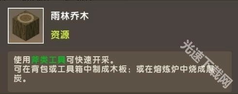 雨林乔木是雨林中随处可见的资源,使用斧类工具砍伐树木就能采集到它。采集来的雨林乔木用途多样,既能用来制作乔木木板、楼梯和台阶,也可以放进熔炉里烧成黑炭。