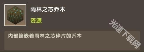 雨林之芯乔木是雨林区域特有的乔木方块,采集该方块能够得到雨林之芯碎片,并且这种乔木在夜晚会散发出明亮的光芒。