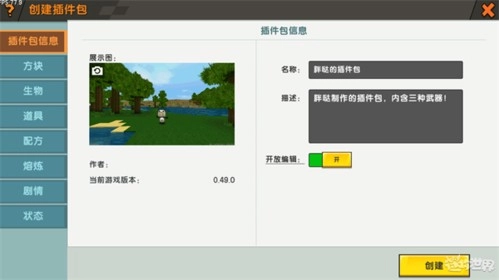 在这里需要填写插件包的名称与描述,还能截取游戏内的画面作为封面。冒险家们也可以设置开放编辑的开关,打开这个开关后,其他小伙伴下载该插件包,就能对里面的内容进行二次编辑啦。