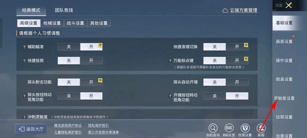 在基础设置、画面设置、操作设置、载具设置、灵敏度设置、拾取设置、效果设置这些选项里,找到“灵敏度设置”并点击进入。