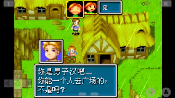 向左走过桥,一块巨大的岩石“咕噜咕噜”地滚落下来,四位神官立刻用法术止住了它的下落。罗宾和杰拉尔德吓得不轻,商量后决定先去南部广场避难。可刚要动身,不知从哪里滚来的巨石就挡住了去路,两人只好沿着仅有的左侧小路绕道继续往南走,路上会碰到些小怪兽,正好可以用来练练手。走到一座小茅屋前时,他们看到罗宾的妈妈正和一群人聚在一起。而罗宾的玩伴杰思敏(ジャスミン)的哥哥嘉尔希亚(ガルシア)竟被大水冲走了,杰思敏悲痛欲绝,朝着河流下游追了过去。这时罗宾的母亲也发现了旁边的两人,便叮嘱他们跟过去照看一下杰思敏。