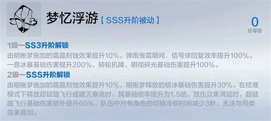 SSS阶段的调整如下:减抗效果再提升10%,最终达到45%;大招基础倍率提高至原来的1.5倍,进一步放大了大招所有基础加成百分比带来的实际收益;切人CD缩短3秒,让启明的“凝大唤大”间隔流程,能与明晰梦自身“子弹大接飞天大”的间隔流程完美适配优化后的输出轴,大幅提升了输出效率,在轮切玩法中收益显著。