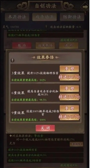 提升重数的方式是进阶,这和系统技能的机制基本相同。若要改变重数的效果,则需通过效果参悟来实现。图中展示的3种效果就是毕业词条,其中3重效果的属性伤害要与技能自身附带的属性伤害保持一致。不过在前期阶段,3种效果都选择攻击加成的收益会更高。建议等精进到一定程度后,再重塑为毕业词条是最佳选择。