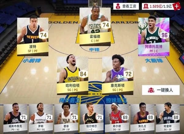一支队伍共有12名球员,每位球员都有对应的薪资。要是你组建的球队工资帽不符合要求,可以在天梯赛界面点击“球场”按钮,快速进入球队管理界面进行调整。