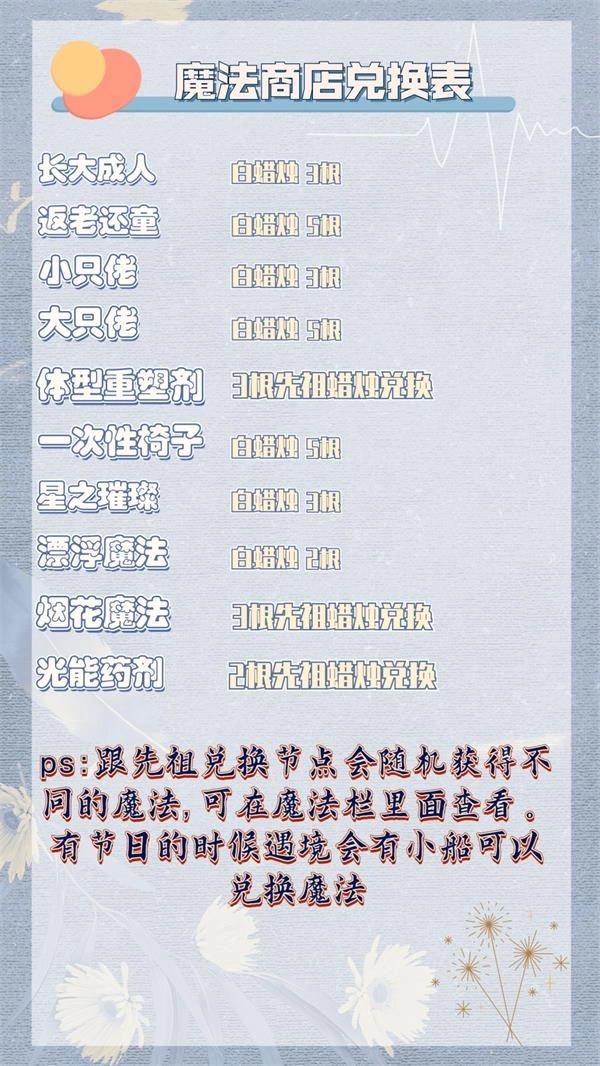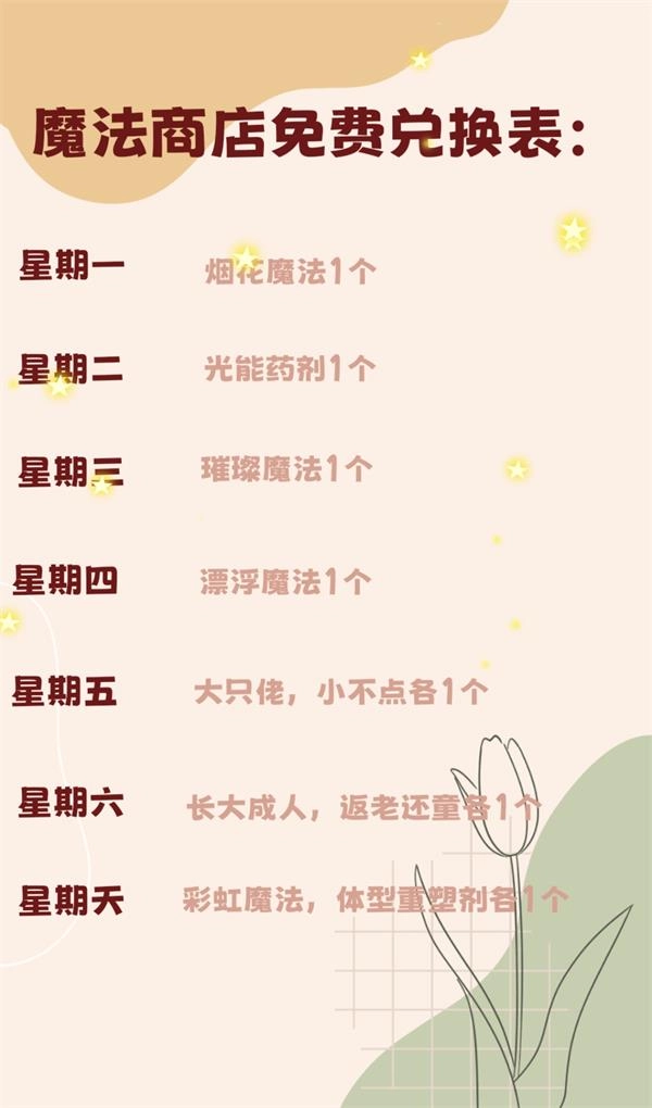 可以免费获取魔法的商店,每天能兑换的物品各不相同,不过这些兑换物品是有规律可循的,具体规律可以查看下面的图片。