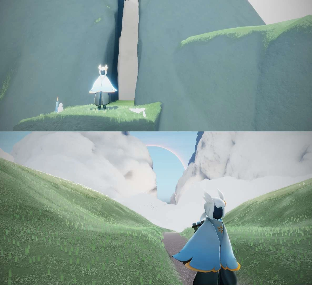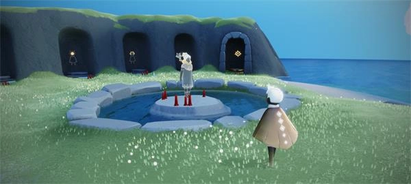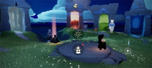从第二个门进去就是云野啦,比起晨岛,云野的空间要大不少。在云野大厅里,总能看到好多小黑聚在这里玩耍聊天,有时还能碰到有小黑在弹琴,旁边围着一圈静静听琴的伙伴。我们可以用手里的烛火挨个点亮他们,再礼貌地鞠个躬。云野虽说地图面积挺大,但这里的风景也确实很不赖。