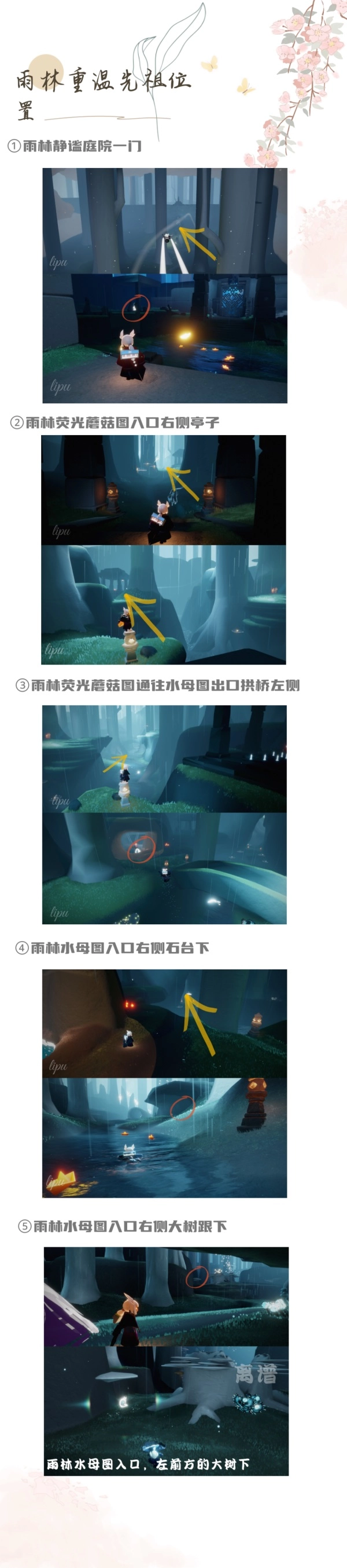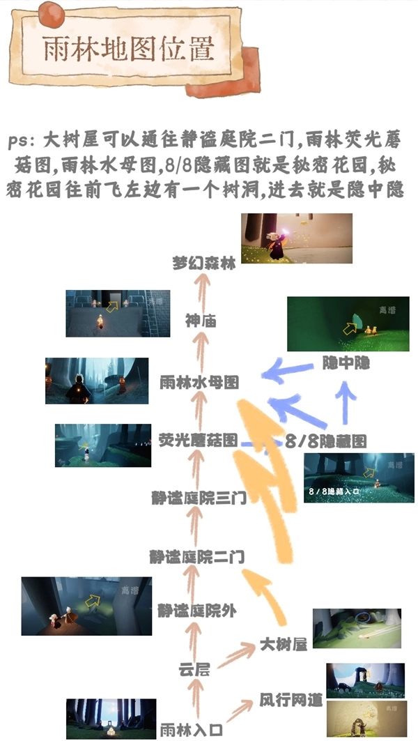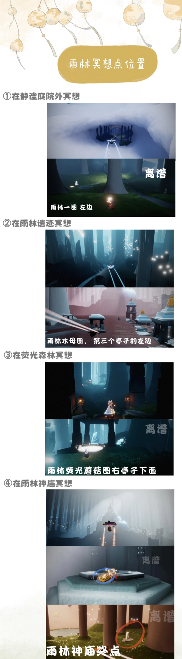 雨林共有四个冥想点:第一个位于雨林一图穿过云层后左侧的静谧庭院;第二个在雨林荧光蘑菇图进门处的显眼亭子内,进入即可看到;第三个在雨林水母图,向前飞行可见三个亭子,左侧小亭子内即为冥想点;最后一个在雨林神庙里,进入神庙后需飞上高台打坐并观看动画,之后到达后方森林,在右侧紧靠最后一棵大树的位置。