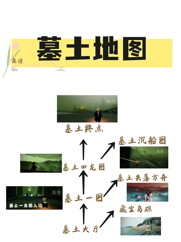 第五个地图是墓土,这也是不少刚入坑的萌新玩家心里的“噩梦”地图!因为里面有会攻击玩家的冥龙和螃蟹,一旦被它们撞到就会掉翼。冥龙发出的嘶吼声听起来也挺吓人的,而且墓土地图里的螃蟹数量比其他地图要多,冥龙也不少。被螃蟹撞到的话,轻则角色变黑,重则直接掉翼,所以萌新们去墓土的时候,一定要记得躲避冥龙、小心螃蟹哦。